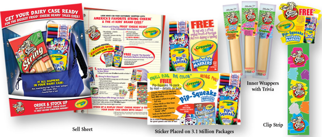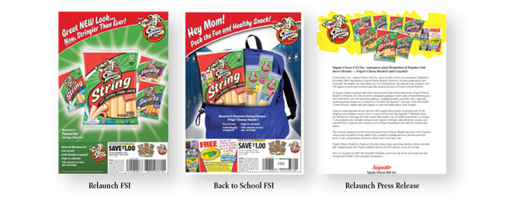 Illustra redesigned the packaging for Frigo Cheese Heads string cheese, created supporting promotional programs and sales materials.